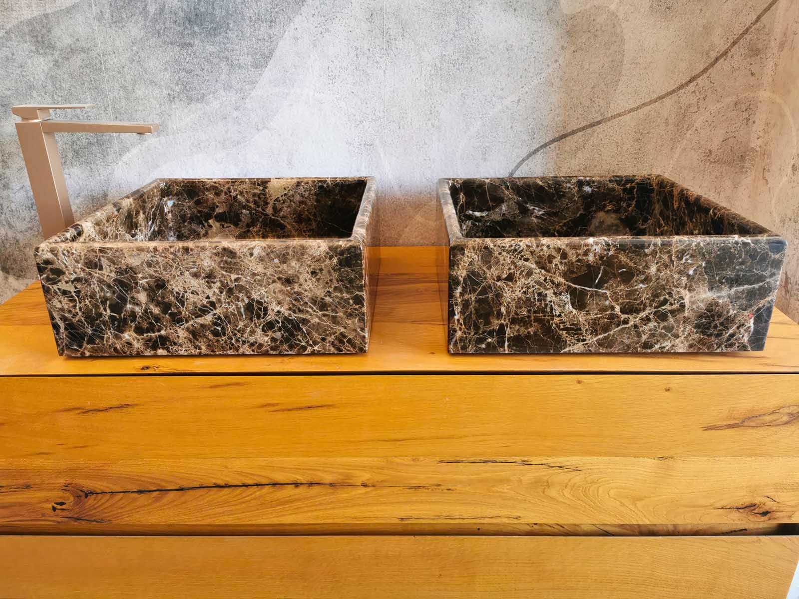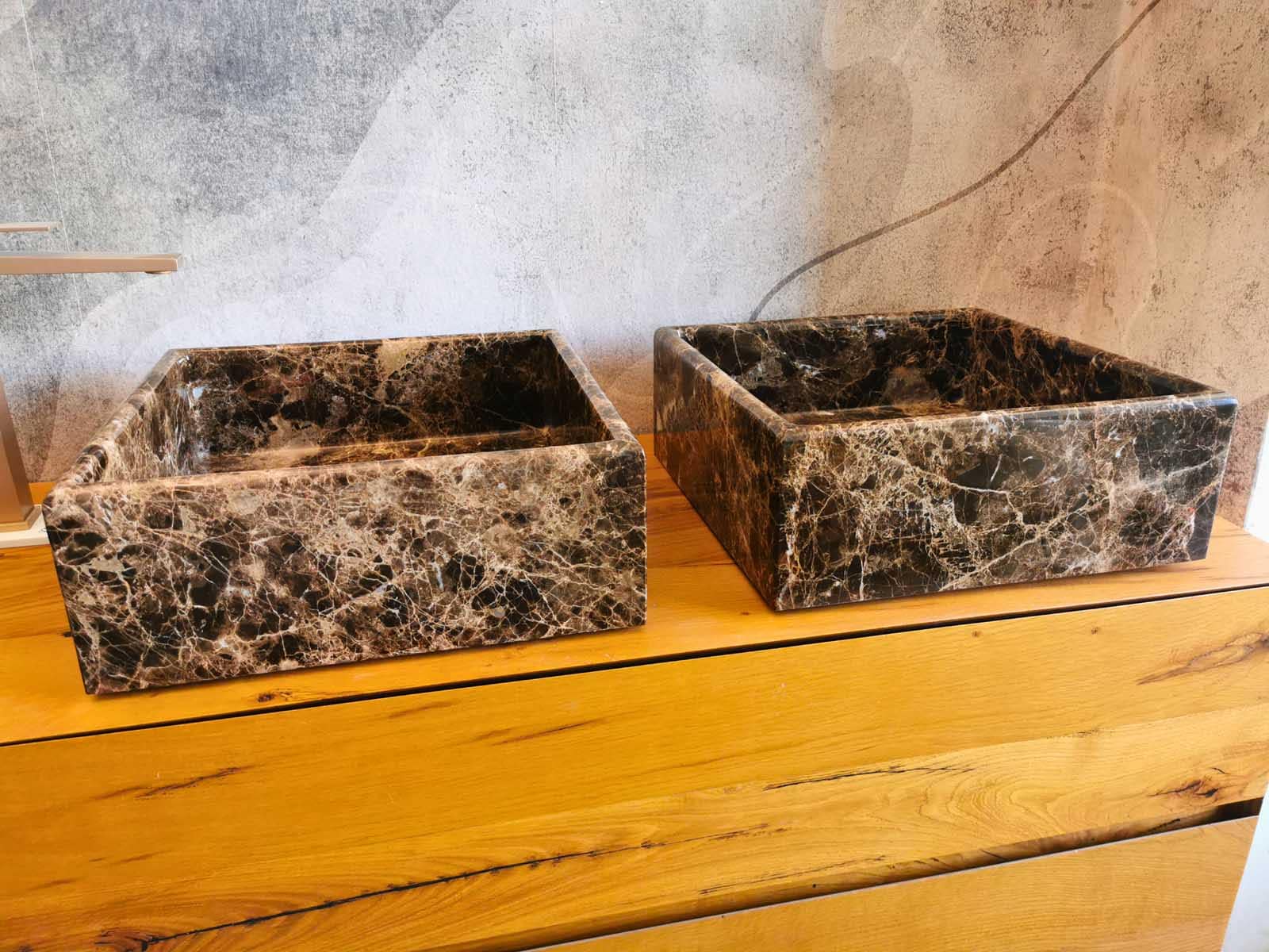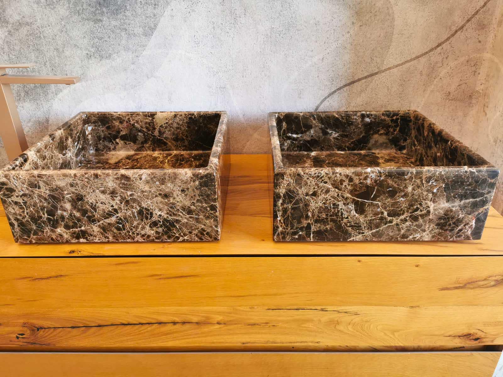 Coppia lavabi in marmo Emperador Dark 40x40x15 cm โ€“ Lavabi quadrati con bordo arrotondato