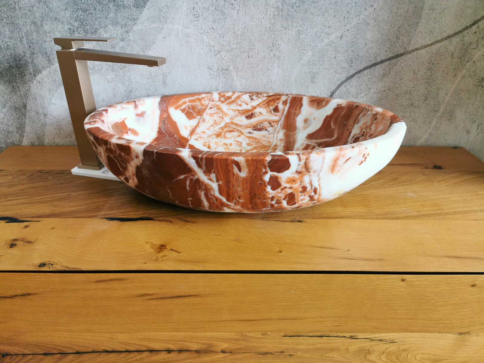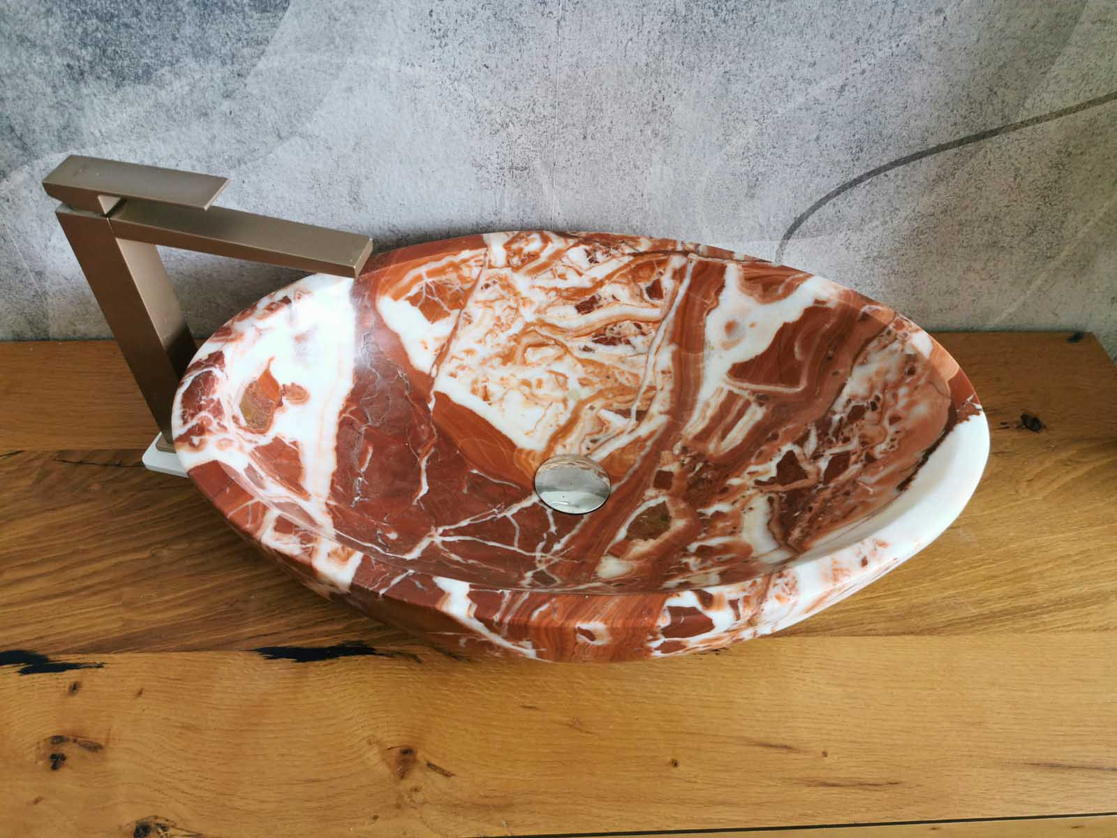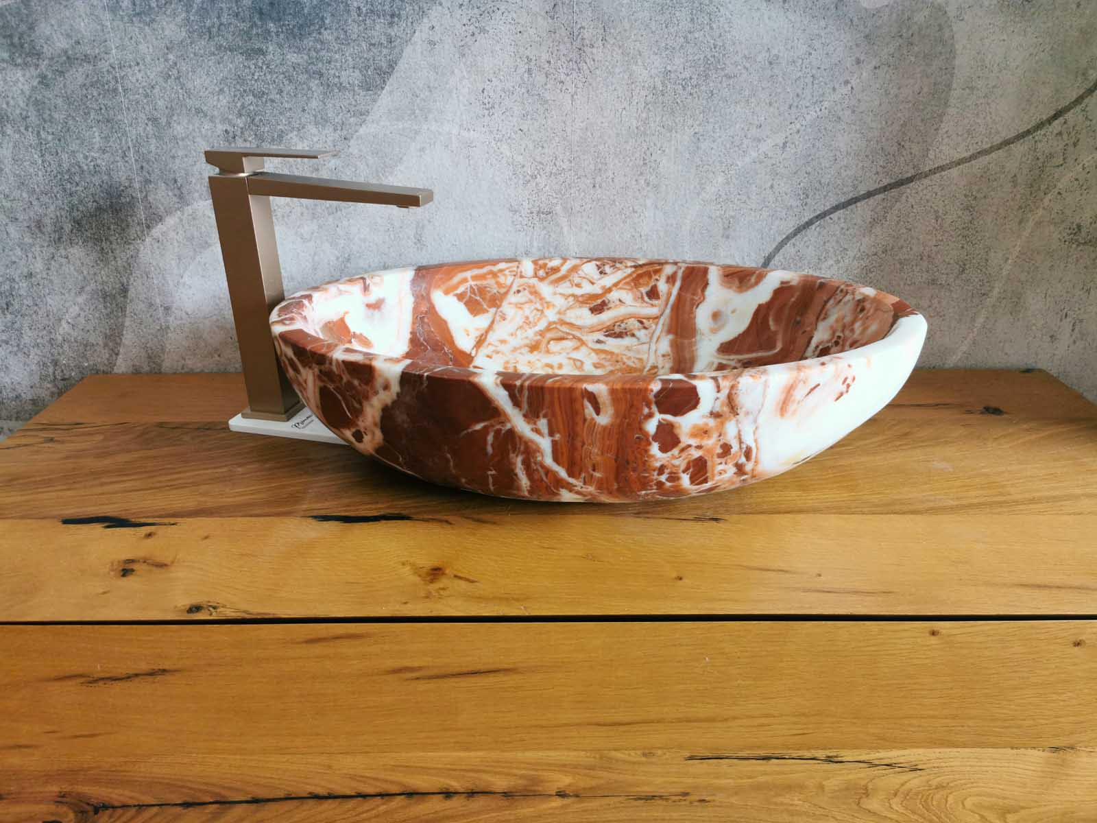 Le foto del prodotto sono reali. Questo lavabo ovale è scolpito da un unico blocco di marmo Red Coral, misura 60×40 cm con altezza 15 cm. Le venature naturali in tonalità rosse e avorio rendono ogni pezzo irripetibile. Il design senza piletta lascia libertà di scelta per l’accessorio di scarico. Perfetto come lavabo da appoggio su top moderni o piani in legno, è un elemento d’arredo che dona carattere e prestigio al bagno.