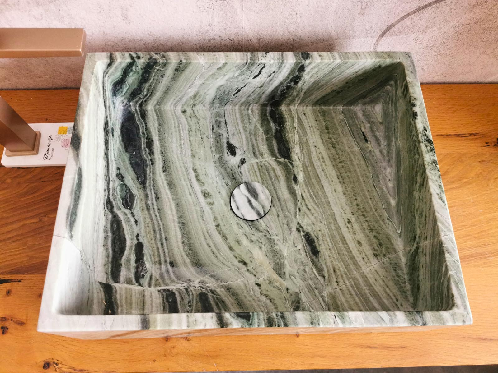 Il marmo verde Sangrilla si caratterizza per una struttura compatta e una trama minerale ricca di variazioni cromatiche. Le venature, che spaziano dal verde bosco al verde smeraldo con leggere inclusioni più scure, rendono ogni pezzo unico. Nessun lavabo è identico all’altro: ogni blocco di pietra racconta una storia naturale irripetibile.