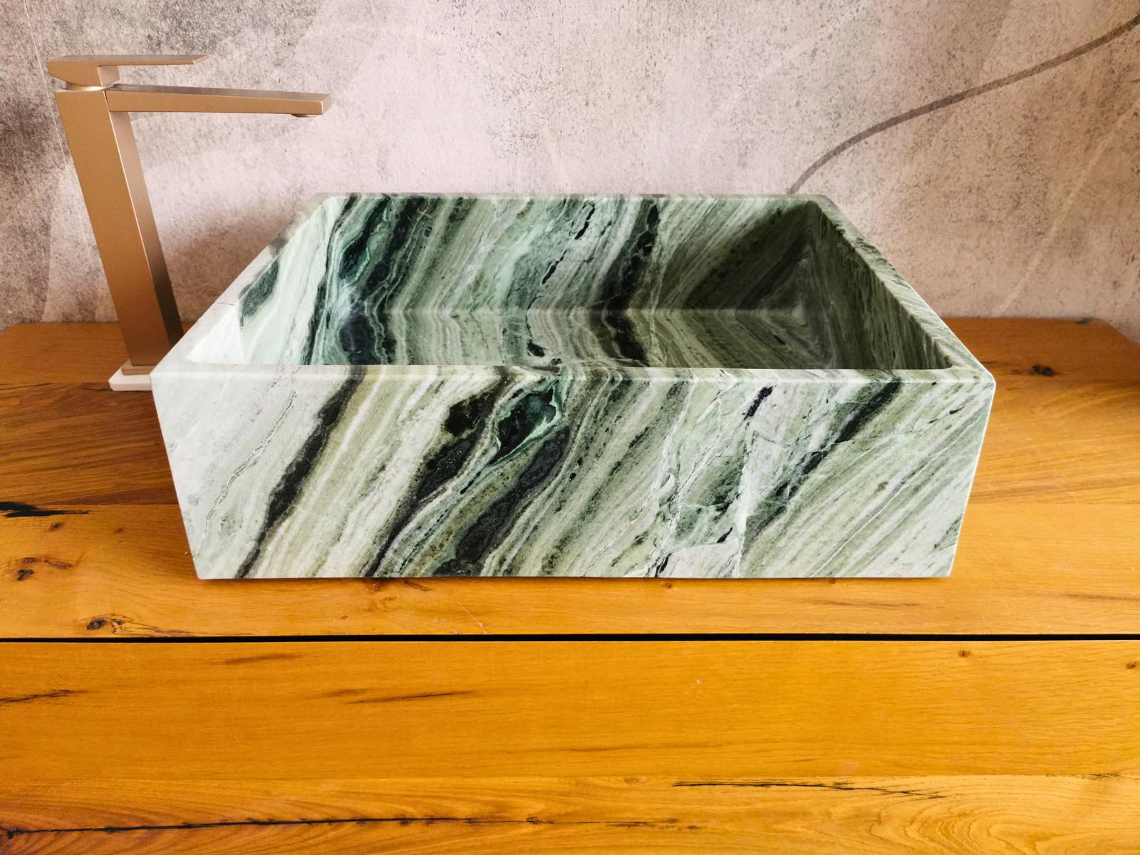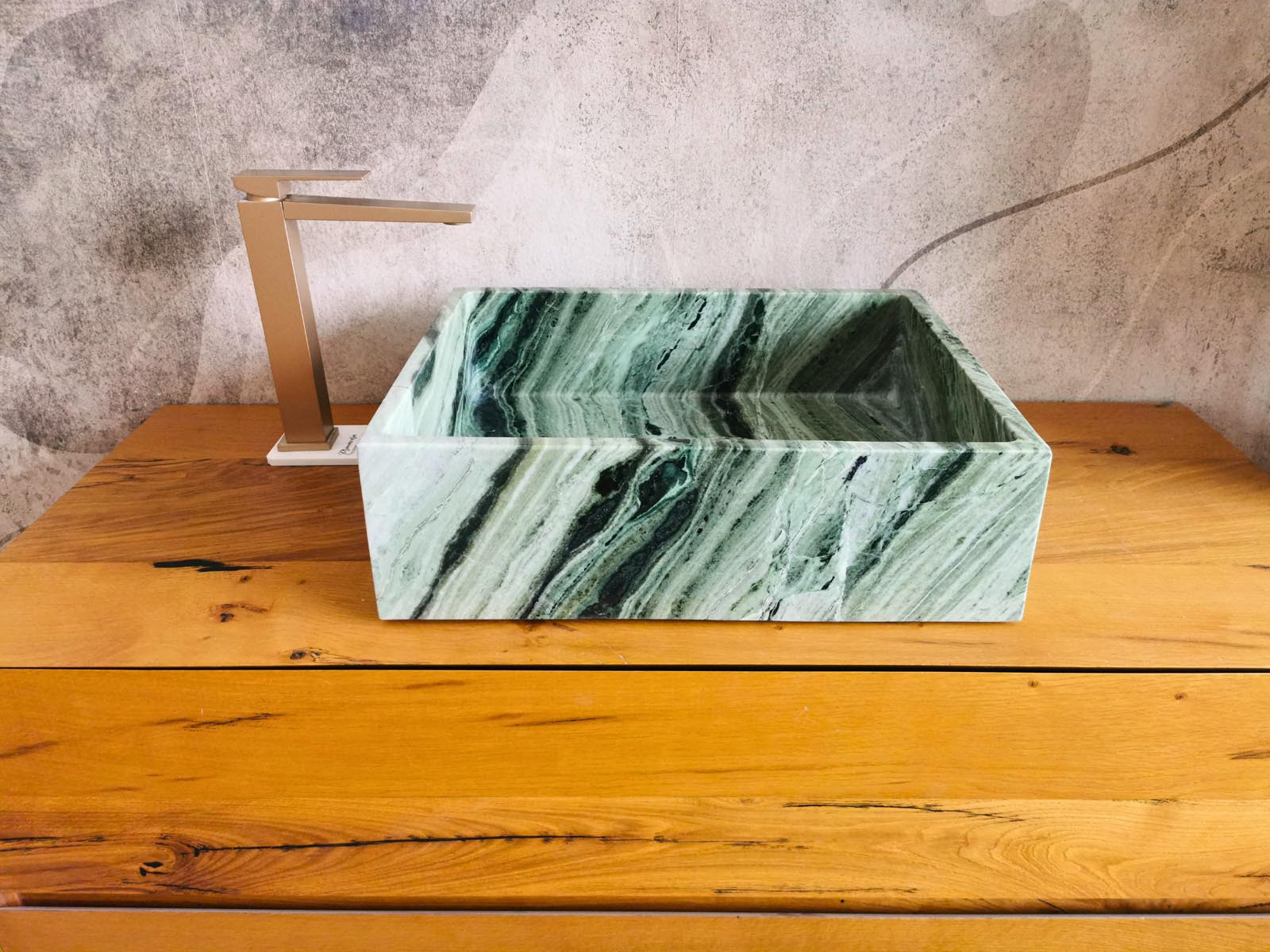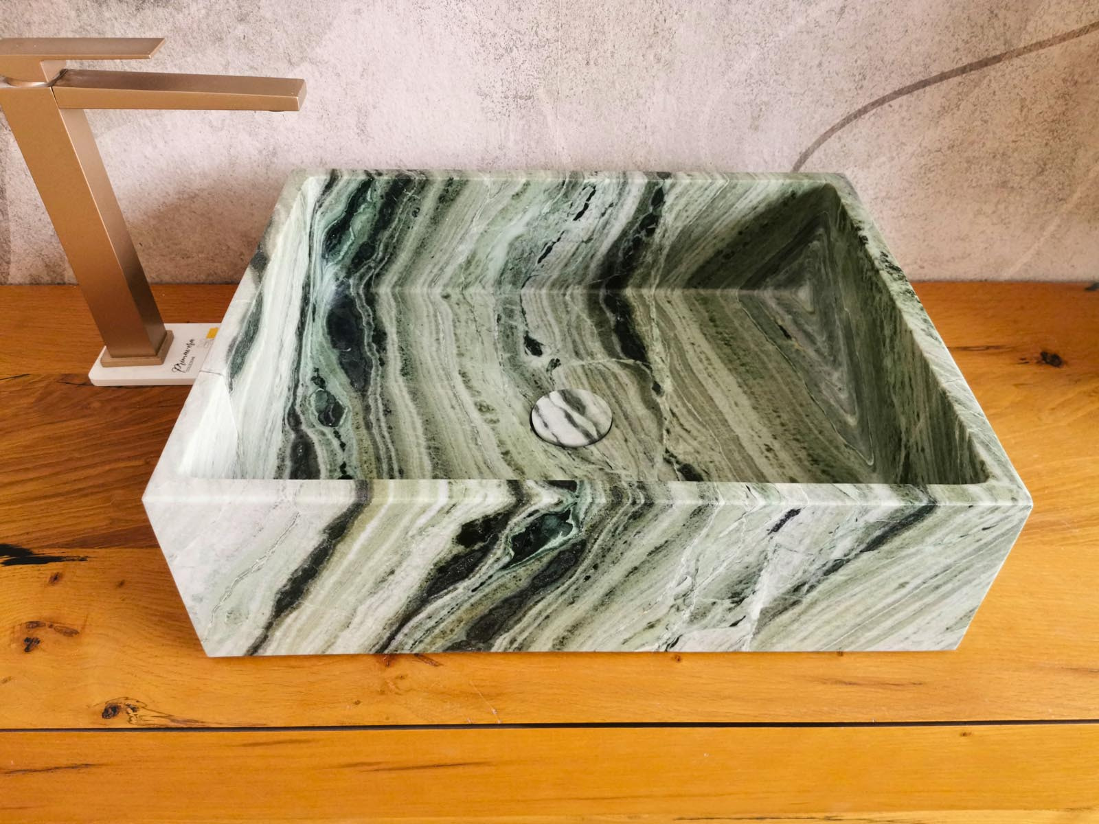Il lavabo da bagno verde in marmo Sangrilla rappresenta una scelta distintiva per ambienti bagno contemporanei ed esclusivi. La tonalità verde intensa, attraversata da venature naturali profonde e sfumature minerali irregolari, conferisce al lavabo una presenza scenografica raffinata.