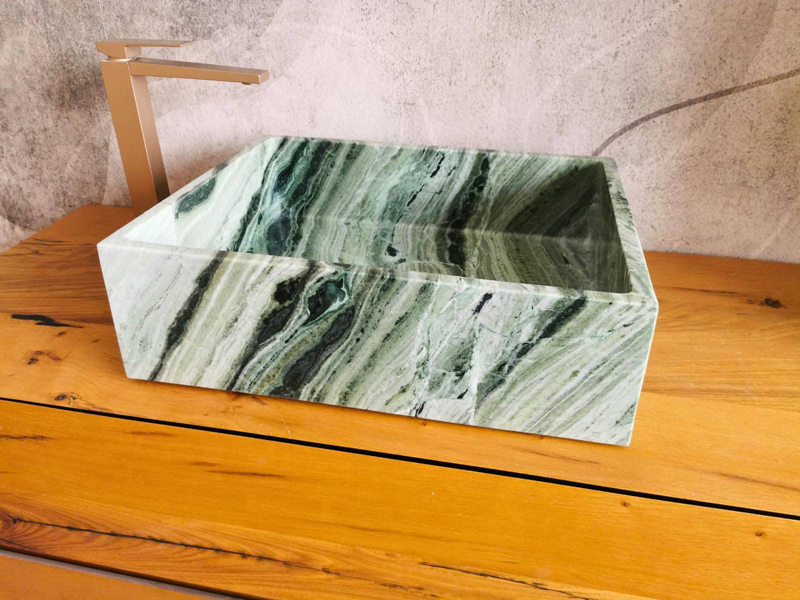 L’installazione deve avvenire su piano bagno stabile e adeguato al peso della pietra naturale. Le variazioni cromatiche e le venature sono caratteristiche intrinseche del materiale: ogni lavabo da bagno verde presenta leggere differenze che ne attestano l’autenticità e l’origine naturale.