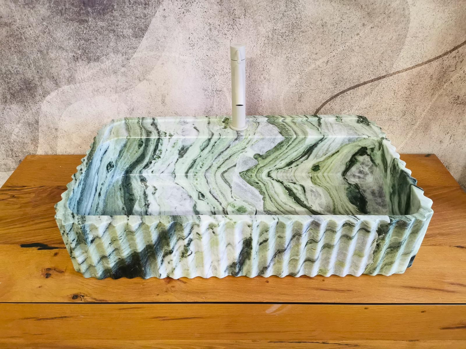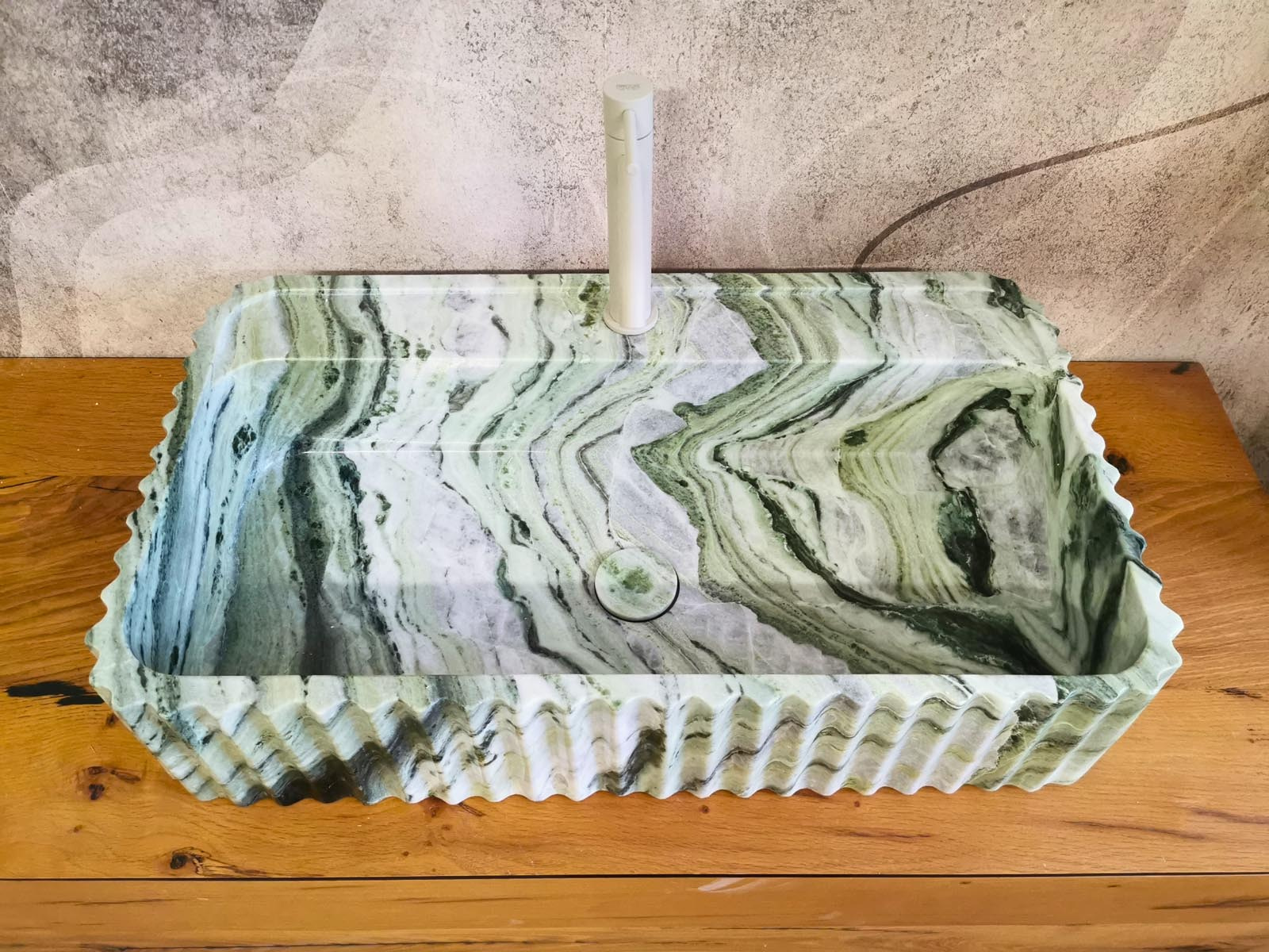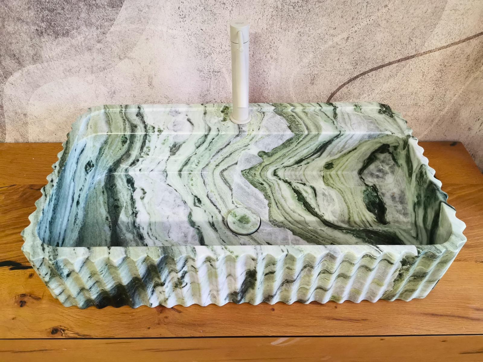 Questo lavabo design verde in marmo Sangrilla unisce estetica contemporanea e funzionalità.