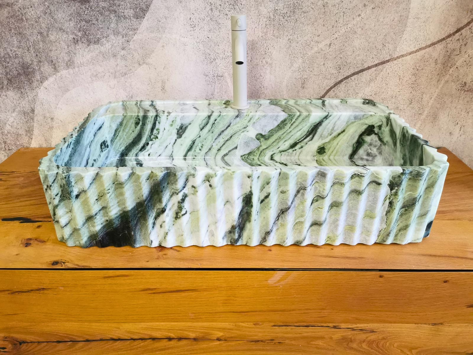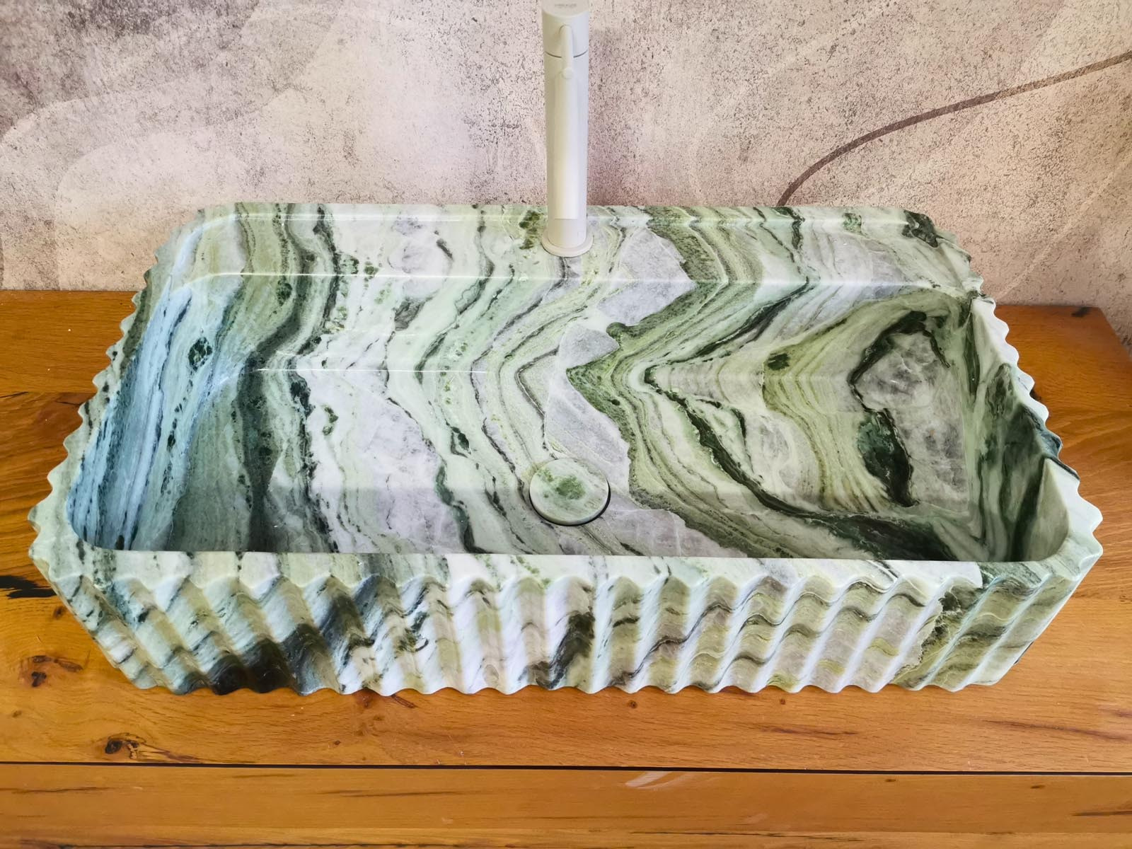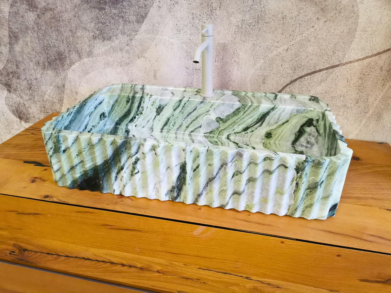 Questo lavabo design verde in marmo Sangrilla unisce estetica contemporanea e funzionalità.