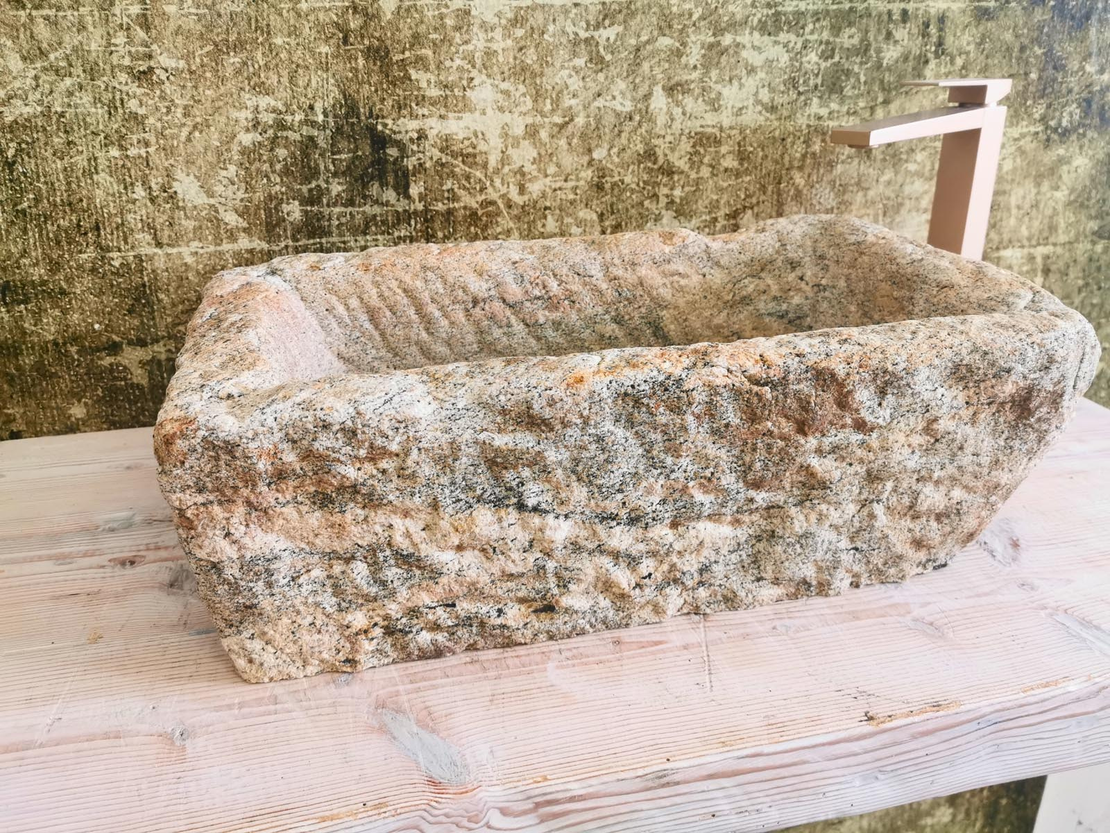 Lavabo grezzo antico in granito naturale 56x33x17 cm, caratterizzato da finitura esterna materica e design rettangolare compatto.