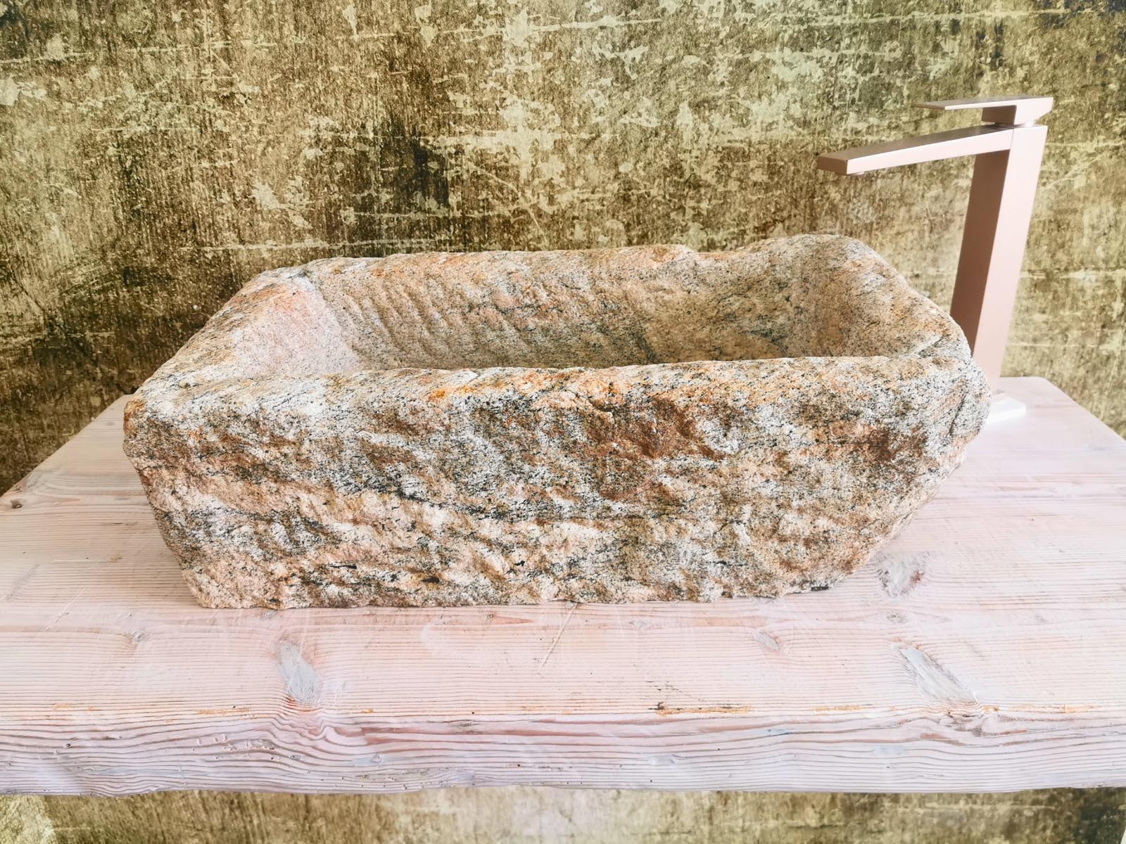 Questo lavello rettangolare esprime tutta la forza estetica del granito: superficie irregolare, texture naturale al tatto, cromie che spaziano dal grigio caldo al beige sabbiato con inclusioni minerali visibili. Ogni pezzo è unico, lavorato artigianalmente per mantenere l’identità originale del materiale.