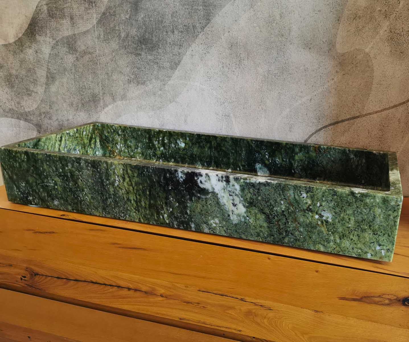 Lavabo da appoggio in marmo naturale Deep Forest, realizzato da un unico blocco di pietra verde con venature bianche e sfumature profonde. Design elegante, finitura lucida e proporzioni perfette per bagni moderni. Misura 100x40x15 cm, foro standard per piletta di scarico (non compresa). Imballato in cassa di legno e spedito con corriere assicurato.