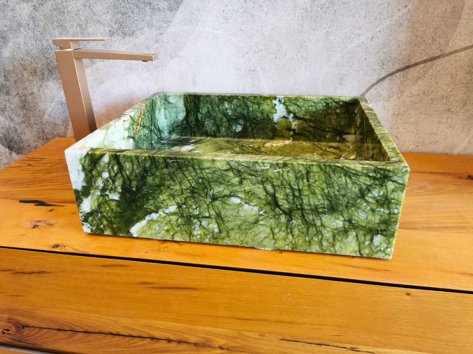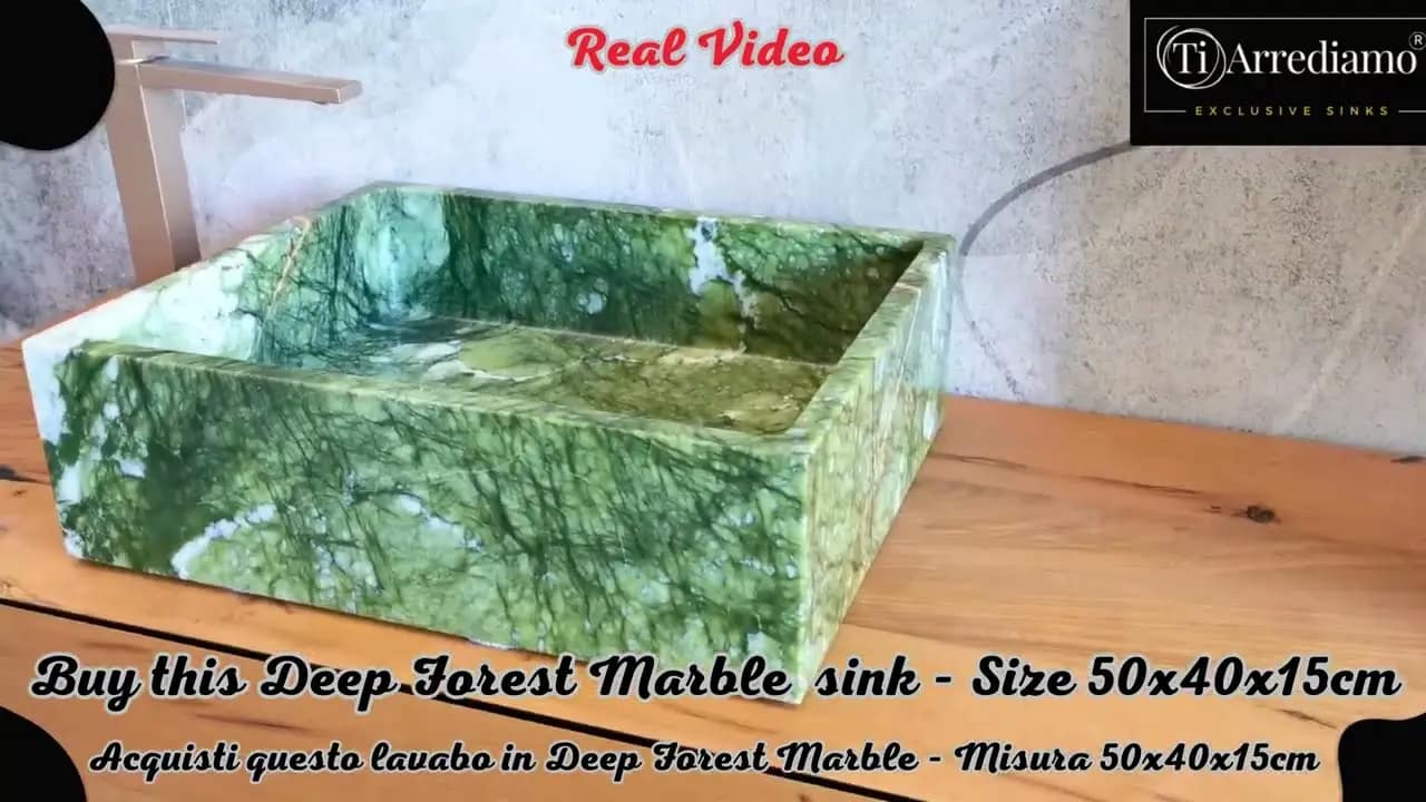 Lavabo da appoggio in marmo naturale Deep Forest, lavorato da un unico blocco di pietra con finitura lucida. Le venature verdi e bianche creano un effetto elegante e unico, perfetto per bagni di design e ambienti raffinati. Misura 50x40x15 cm, foro standard per piletta di scarico (non compresa). Imballaggio in cassa di legno e spedizione con corriere assicurato.