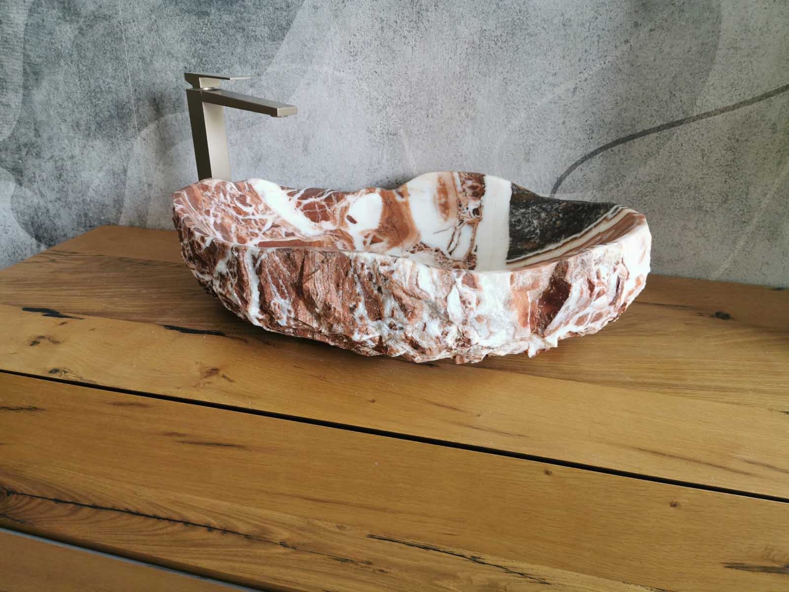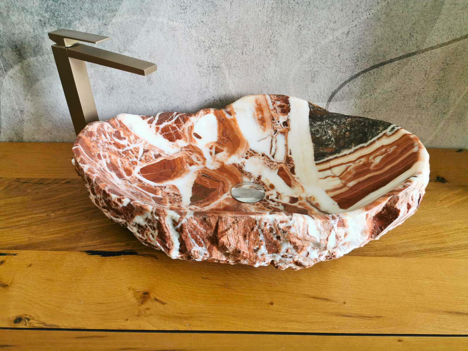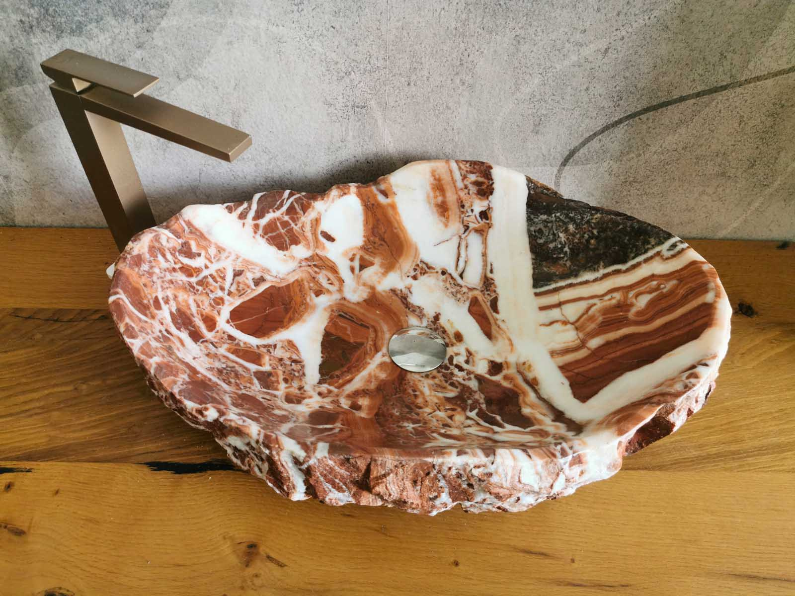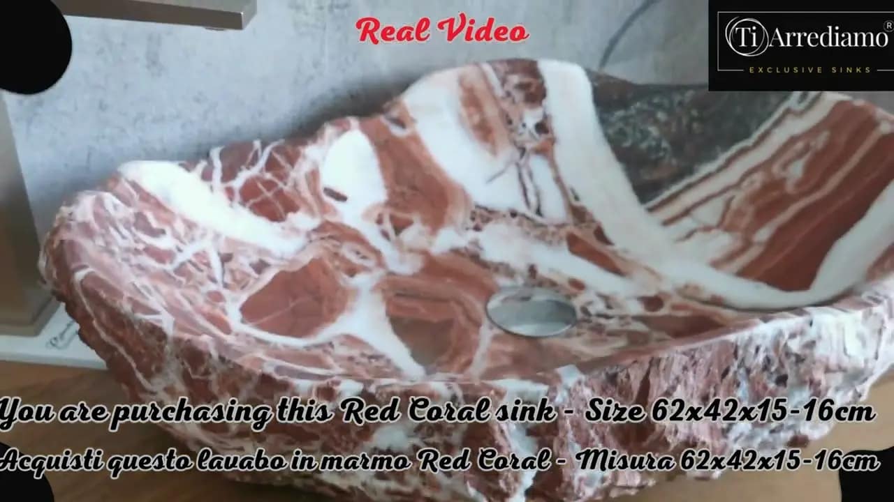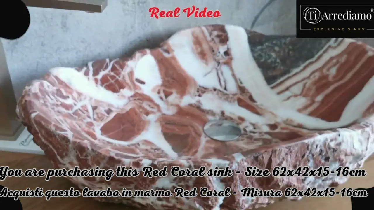 Questo lavabo da appoggio è scolpito in marmo Red Coral naturale, con dimensioni 62×42 cm e altezza 15-16 cm.