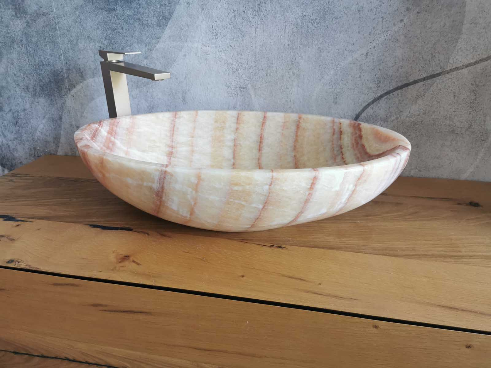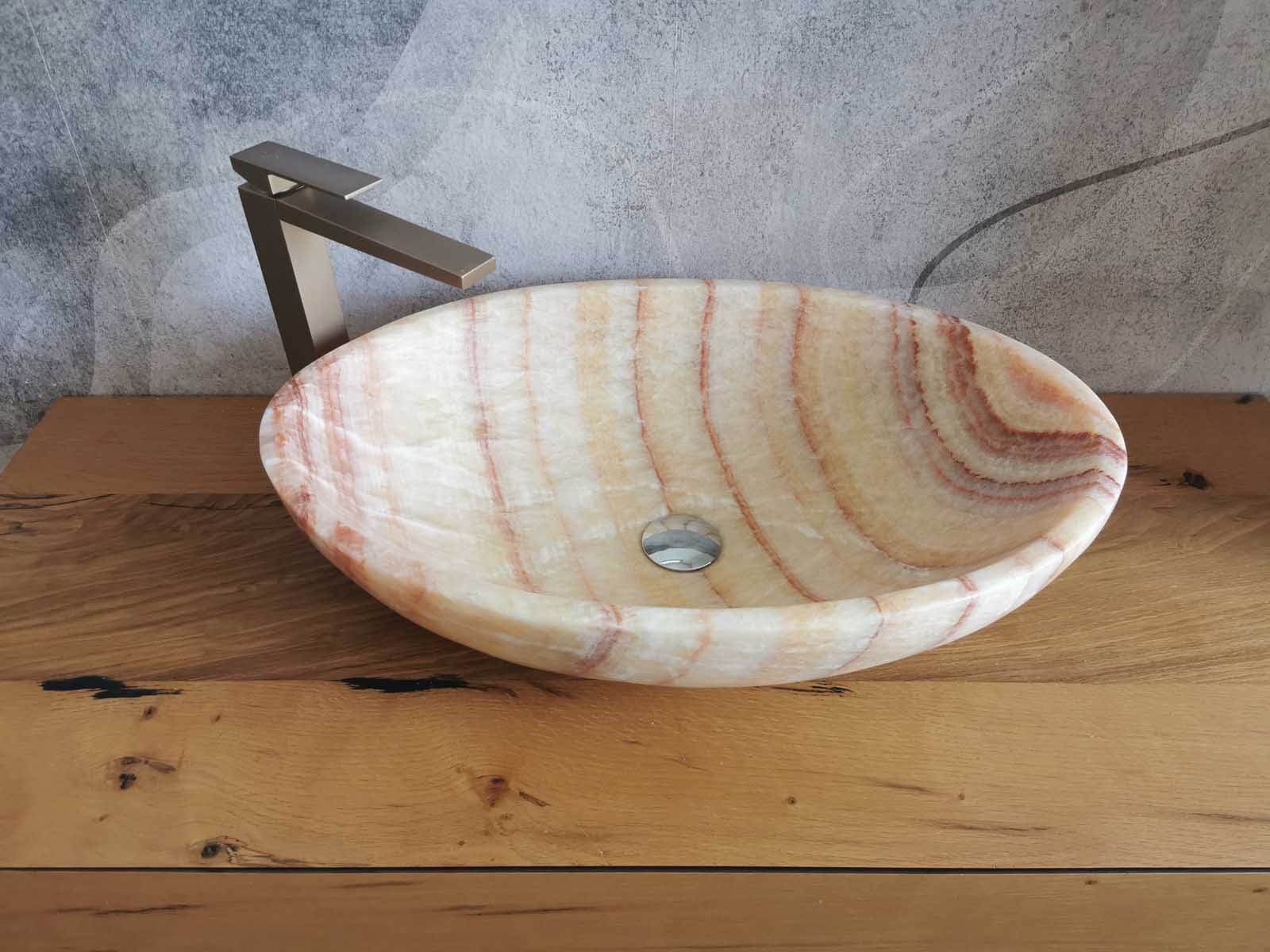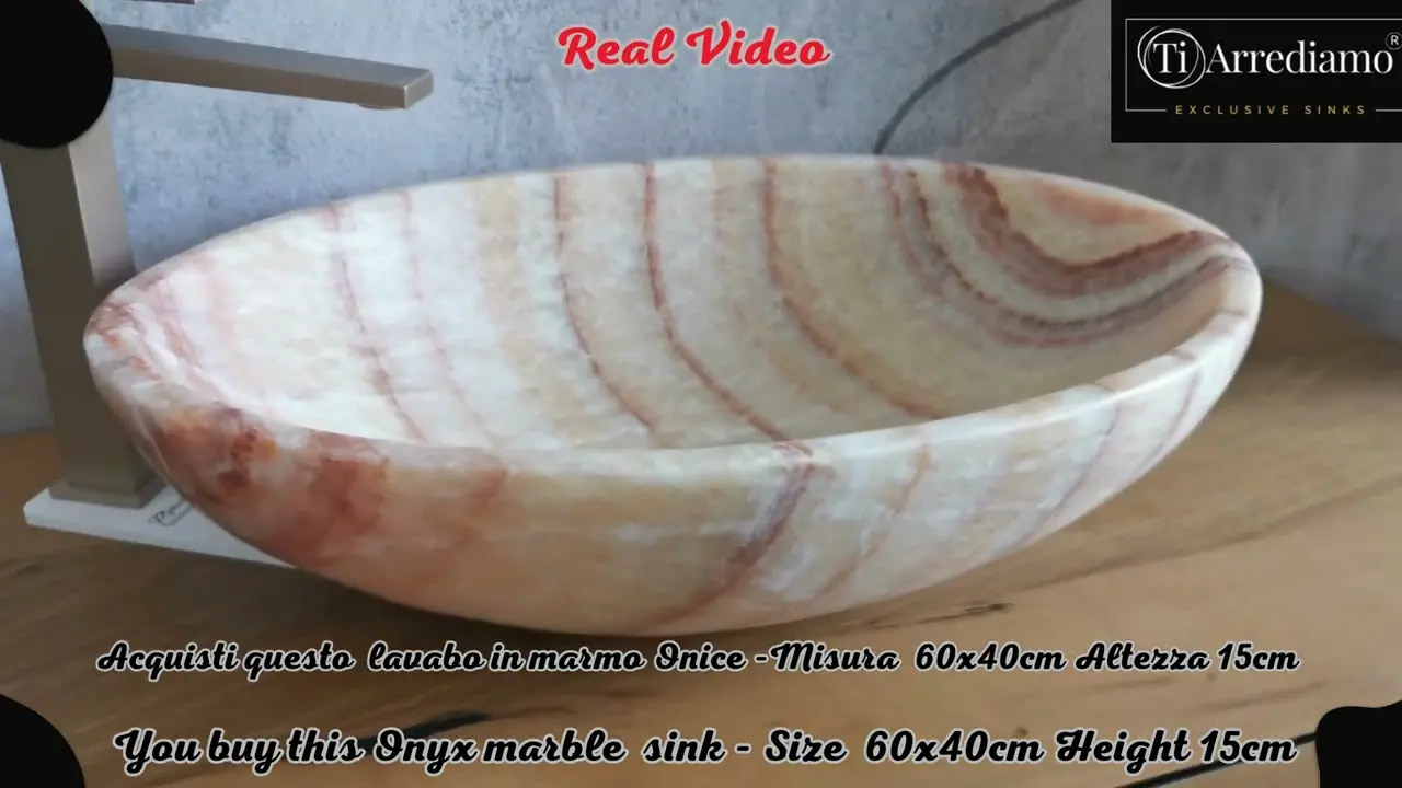 Il lavabo ovale da appoggio in marmo onice naturale (60x40x15 cm) รจ un pezzo dโ€™arredo esclusivo per bagni moderni ed eleganti. Le venature calde e luminose rendono ogni lavandino unโ€™opera unica. La finitura lucida esalta la profonditร  della pietra, donando raffinatezza e resistenza.