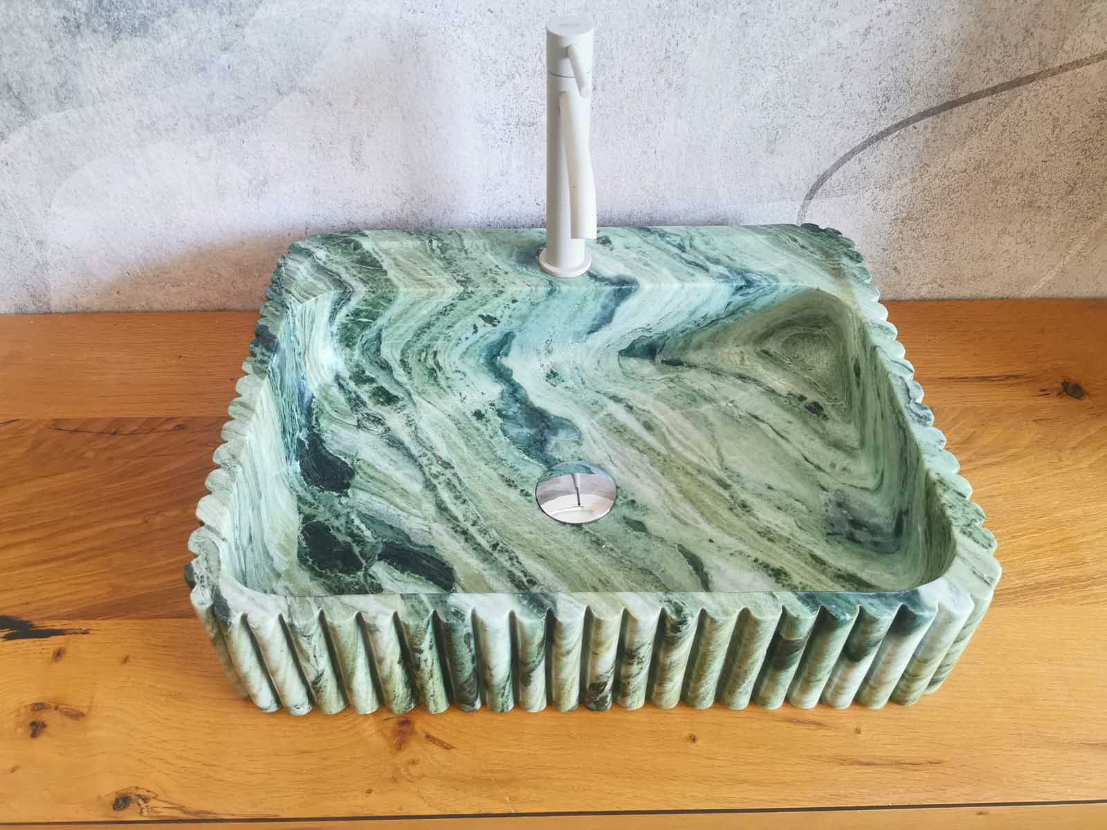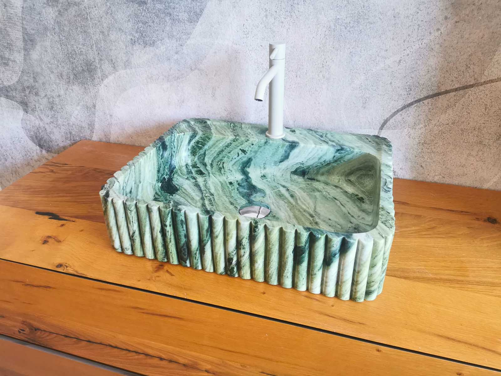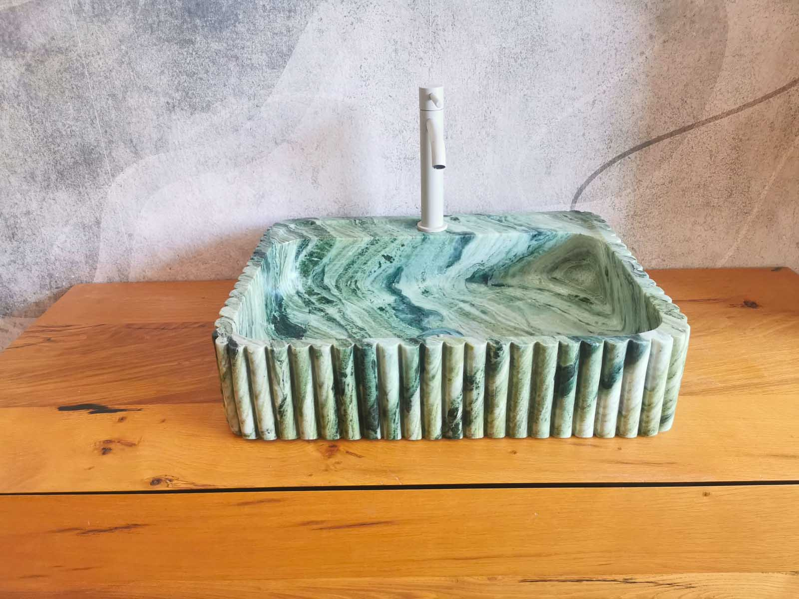 Questo lavandino verde da appoggio in marmo naturale è caratterizzato da eleganti scanalature verticali che valorizzano il design e ne esaltano la presenza scenica.