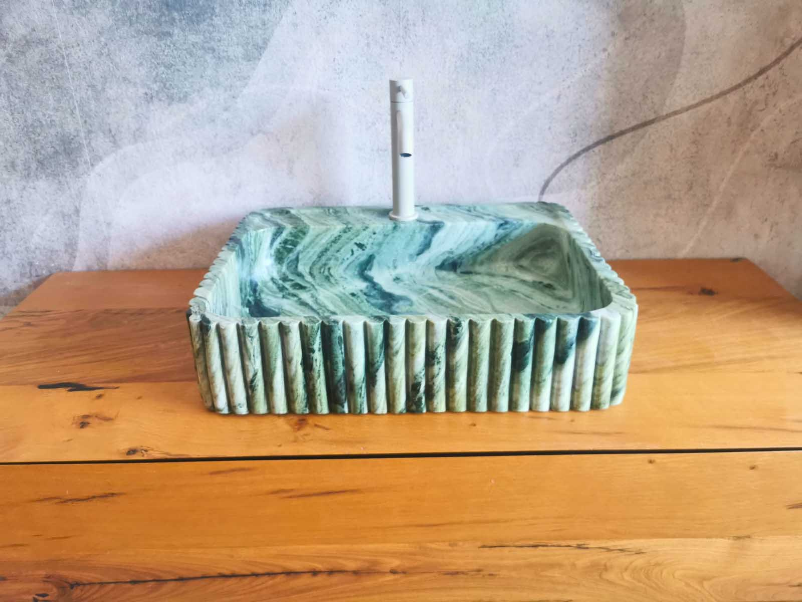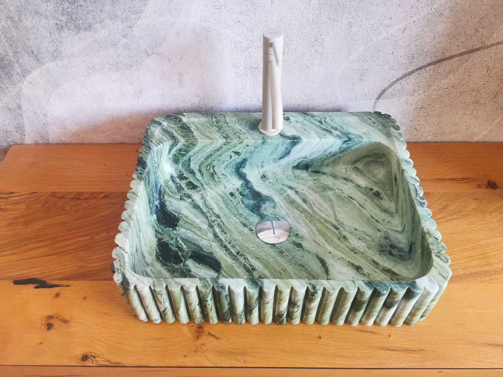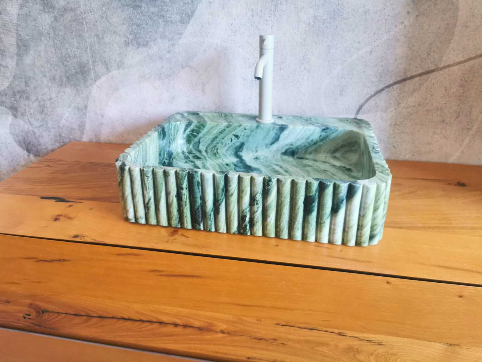 Questo lavandino verde da appoggio in marmo naturale รจ caratterizzato da eleganti scanalature verticali che valorizzano il design e ne esaltano la presenza scenica.