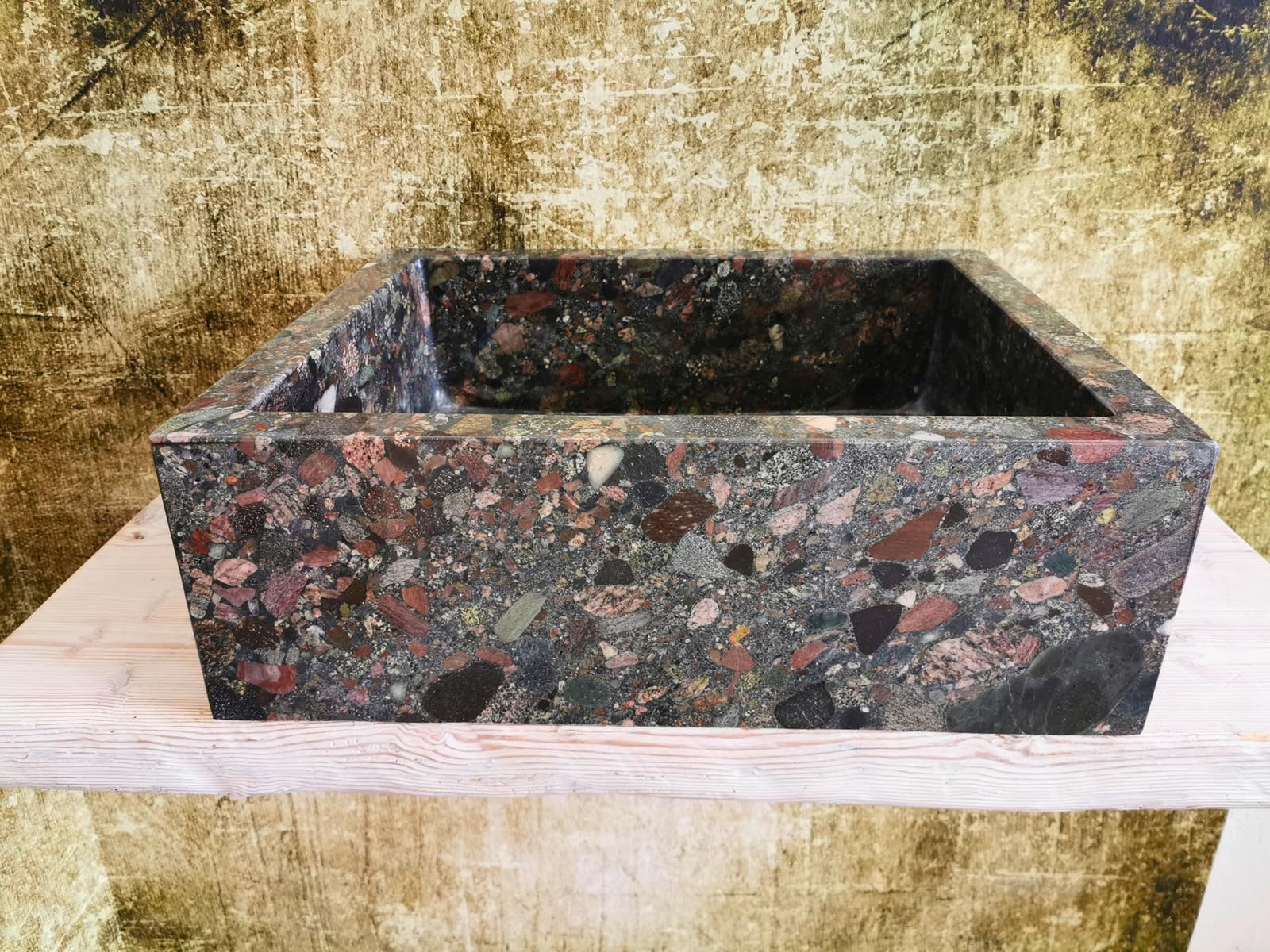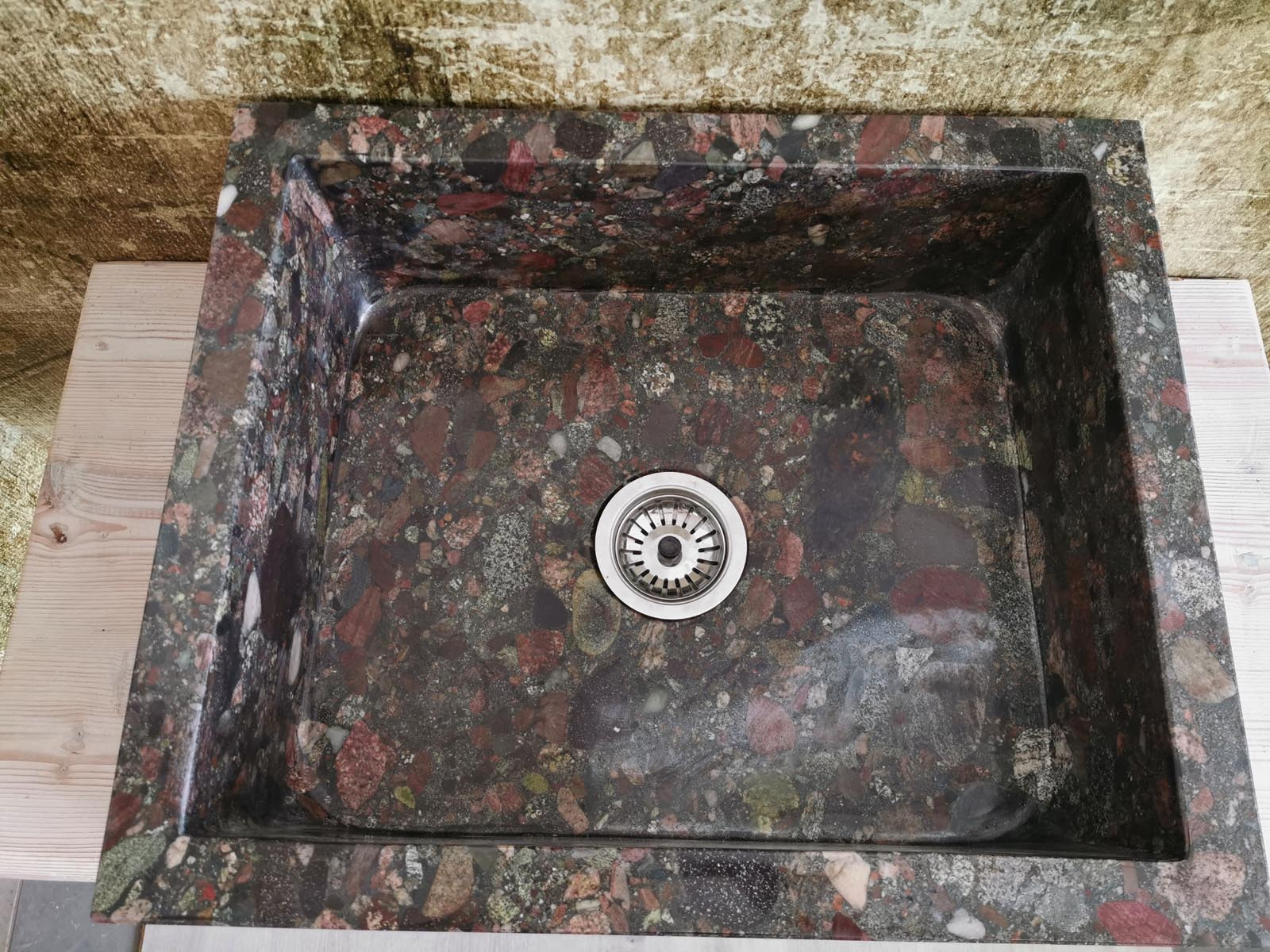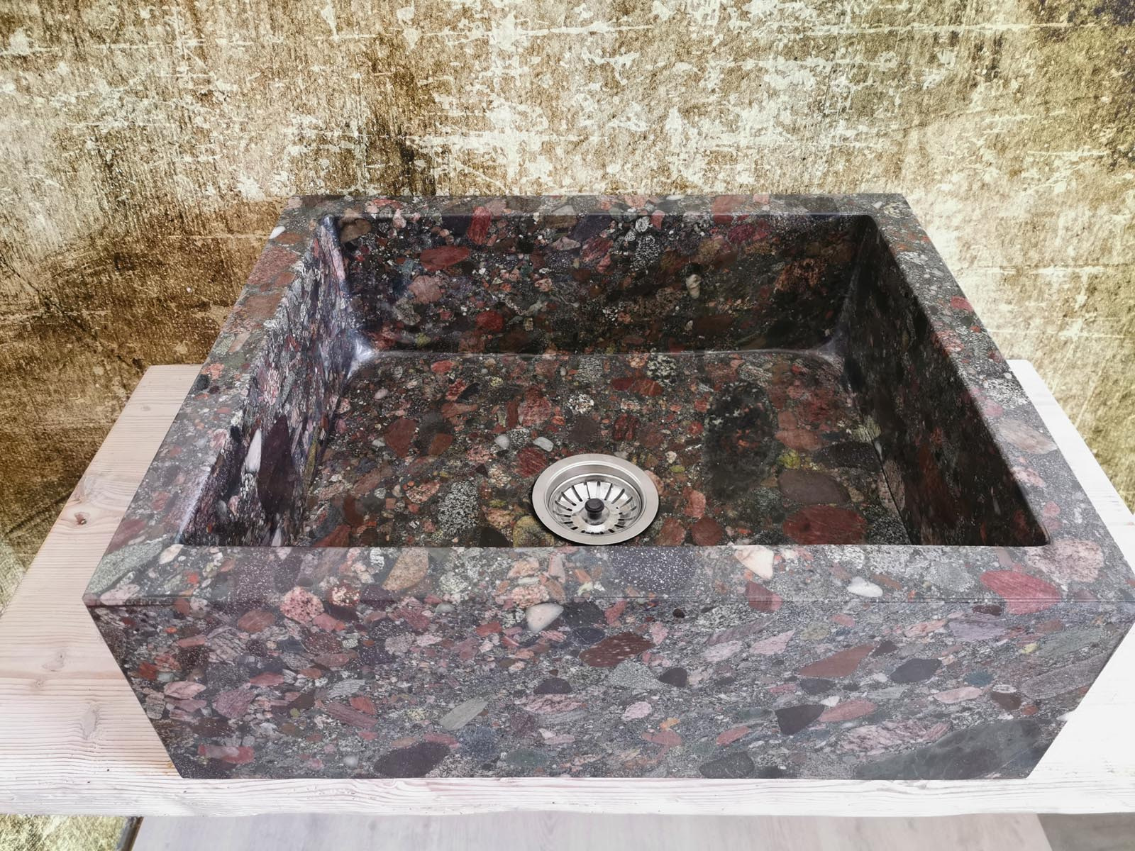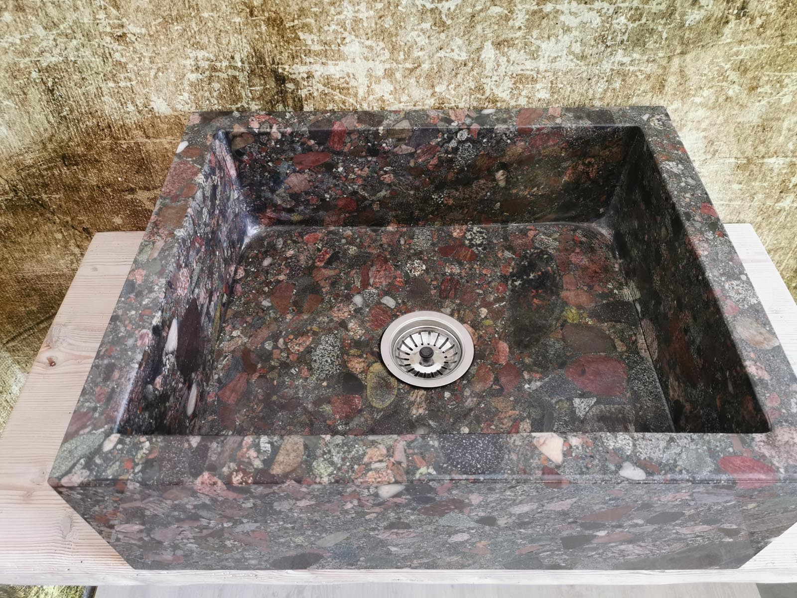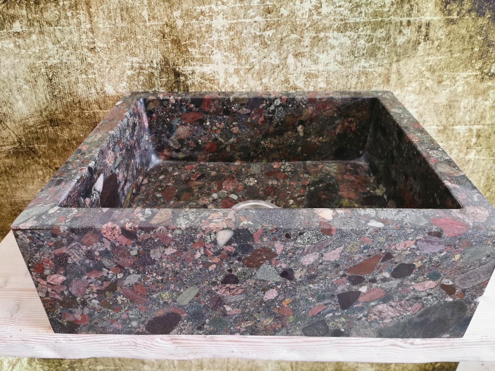 Il granito Seven Colors è una pietra naturale compatta, caratterizzata da una grana strutturata e da una tessitura ricca di micro cristalli visibili. Ogni blocco presenta combinazioni cromatiche differenti: venature sabbia, tocchi avorio e leggere inclusioni più scure che donano profondità visiva. Questo rende ogni lavello un pezzo unico, impossibile da replicare industrialmente.