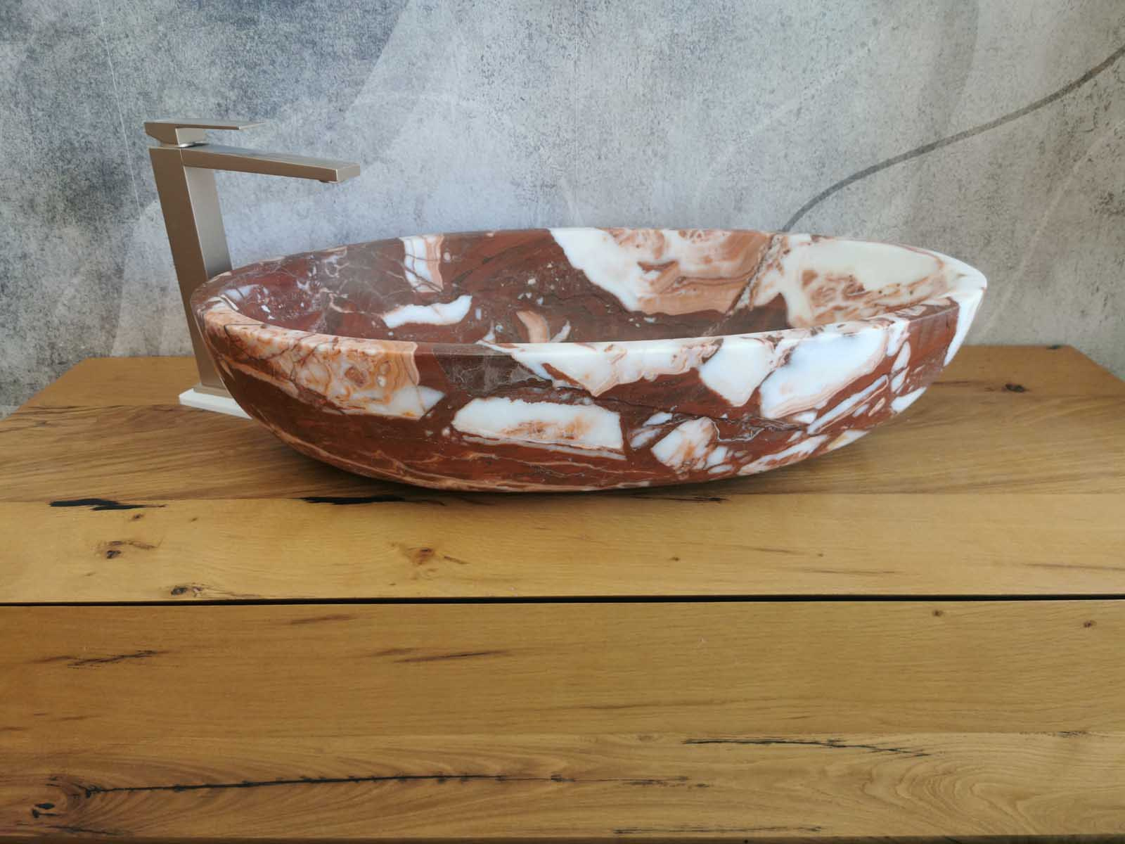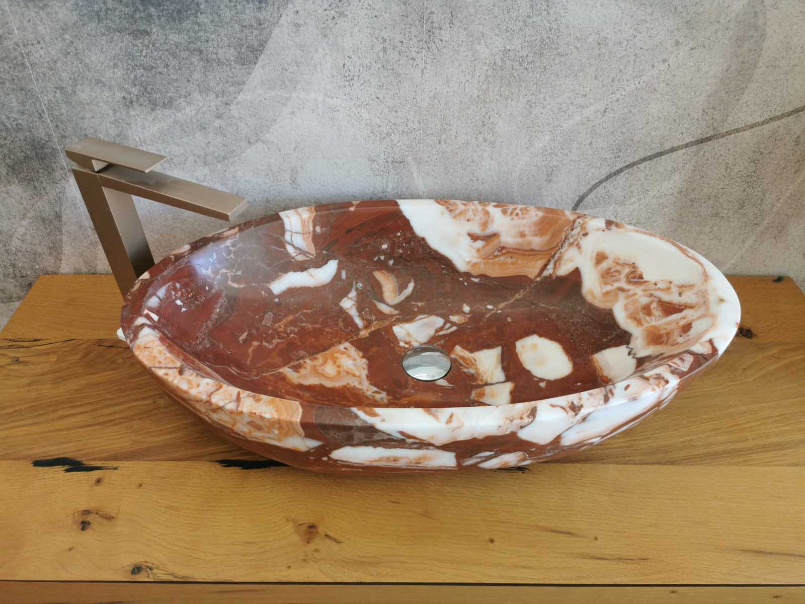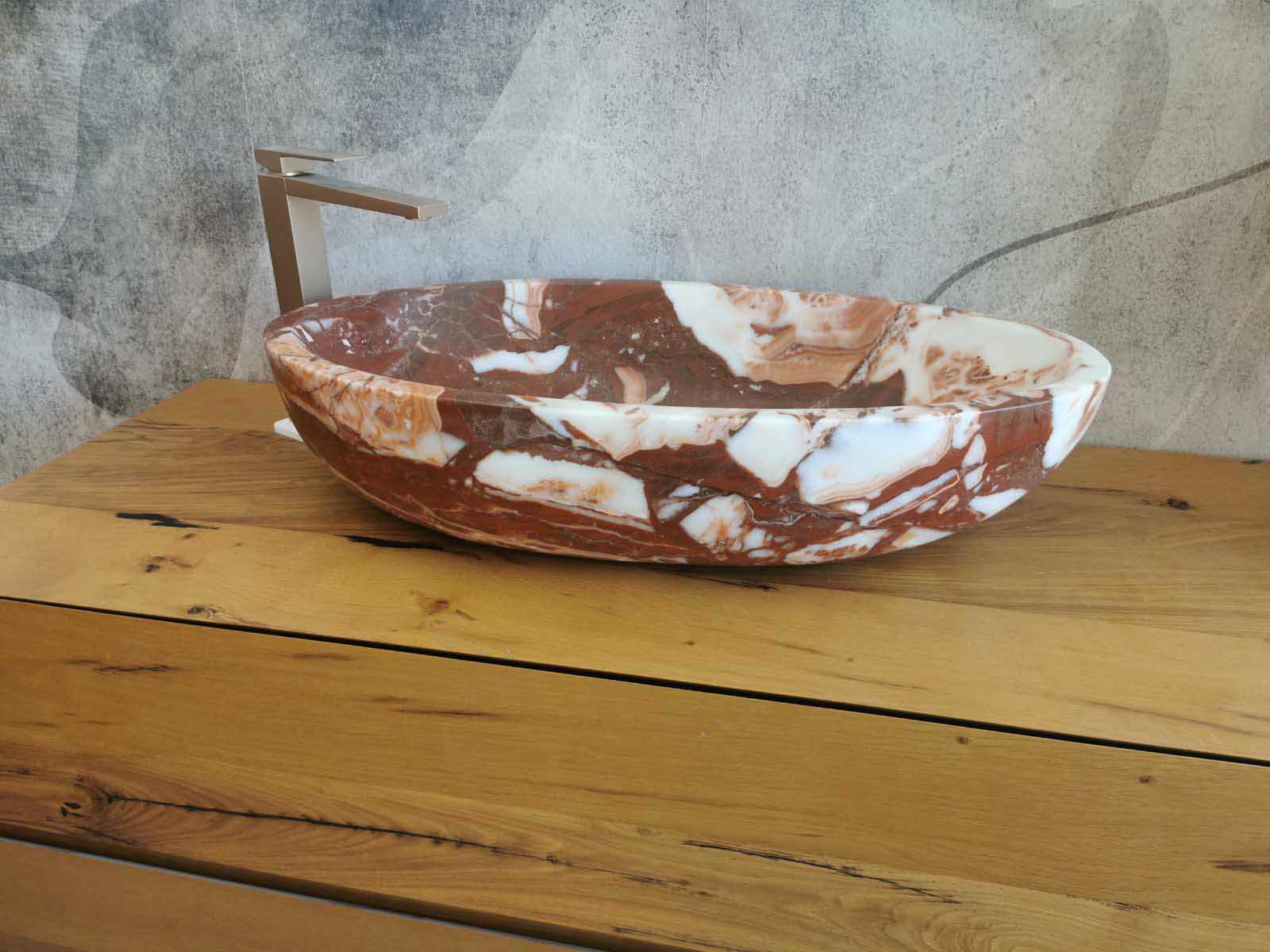Questo lavello da bagno in marmo Red Coral, dalla forma ovale e misura 70x40x15 cm, unisce raffinatezza e soliditร . Le tonalitร  calde del rosso, percorse da venature naturali piรน chiare, conferiscono movimento e un carattere esclusivo allโ€™ambiente.