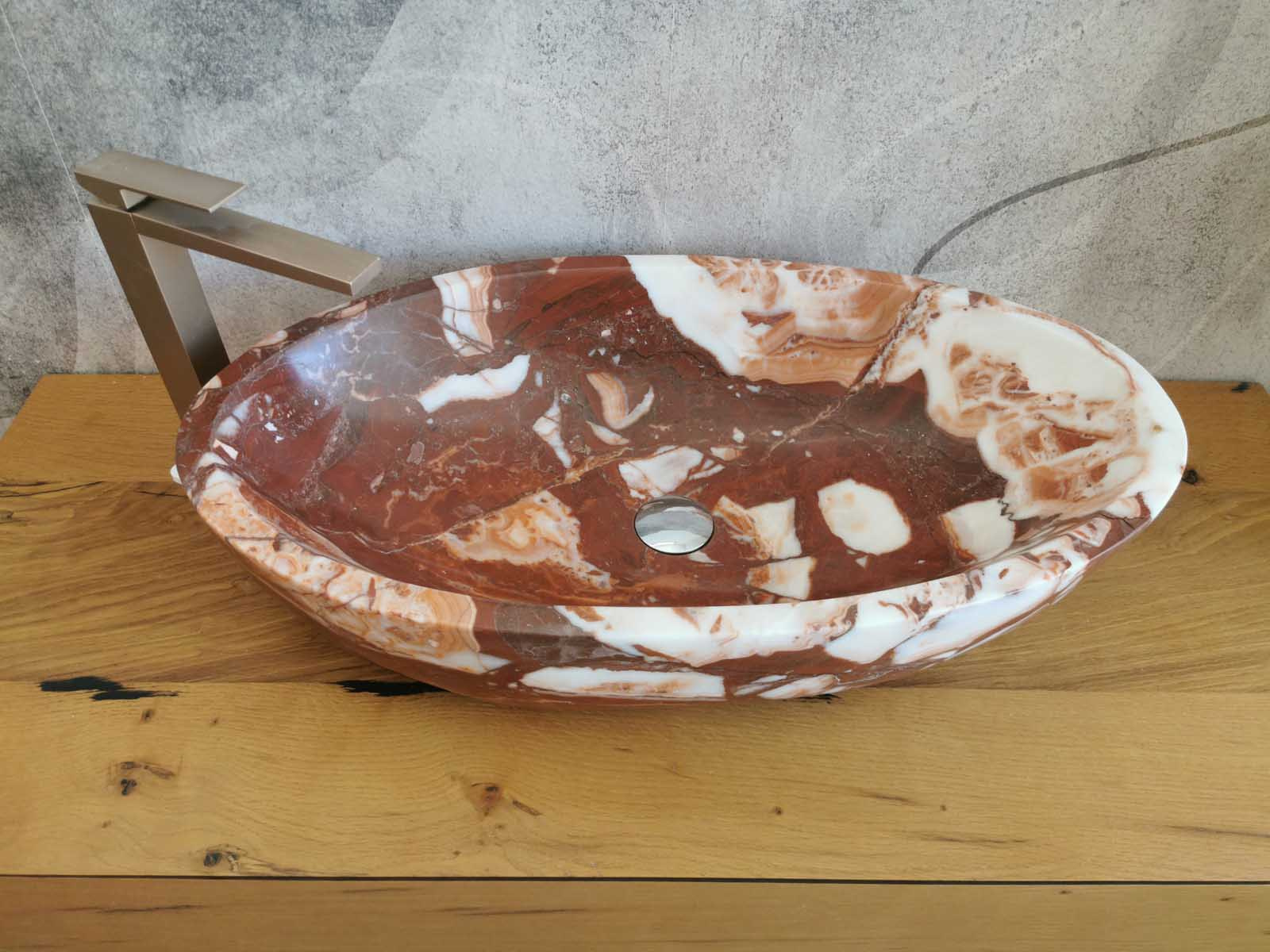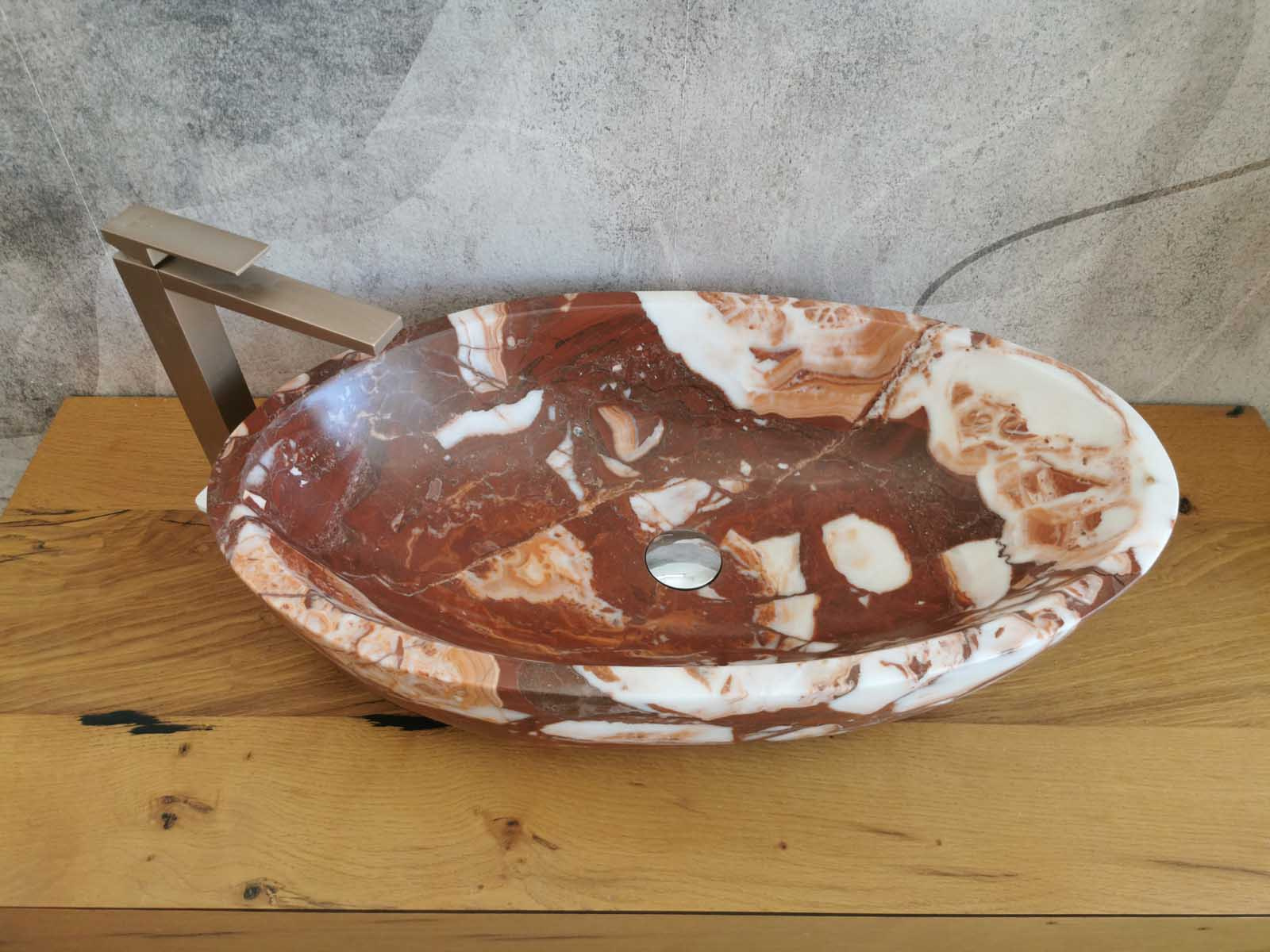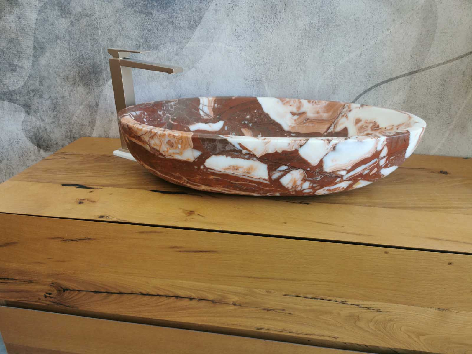Questo lavello da bagno in marmo Red Coral, dalla forma ovale e misura 70x40x15 cm, unisce raffinatezza e soliditร . Le tonalitร  calde del rosso, percorse da venature naturali piรน chiare, conferiscono movimento e un carattere esclusivo allโ€™ambiente.