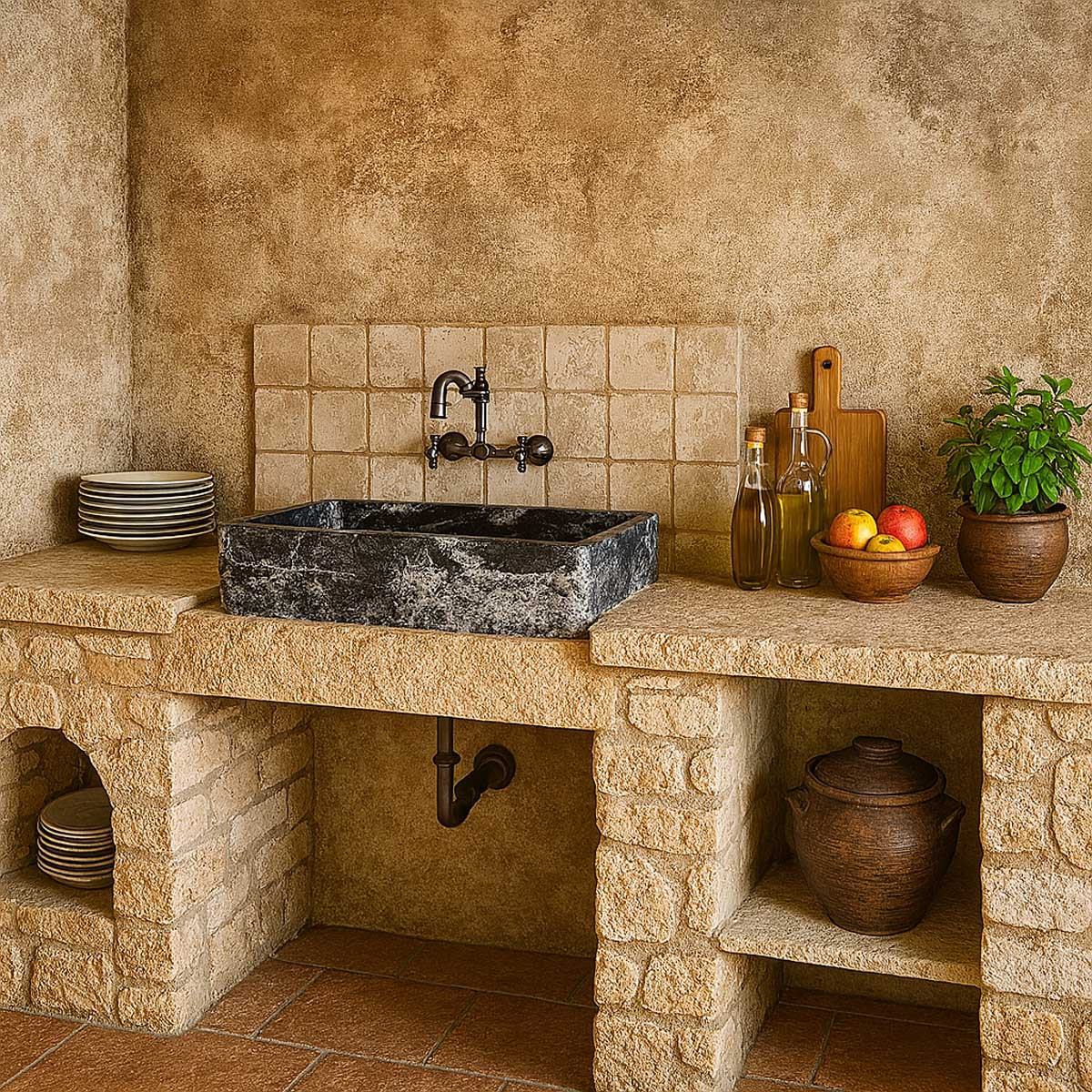 Grazie alle sue dimensioni generose, questo lavello offre uno spazio comodo per l’uso quotidiano e contribuisce a rendere la cucina più armoniosa e ricercata. Un modello pensato per chi apprezza la solidità visiva della pietra naturale e desidera un prodotto dal carattere autentico.